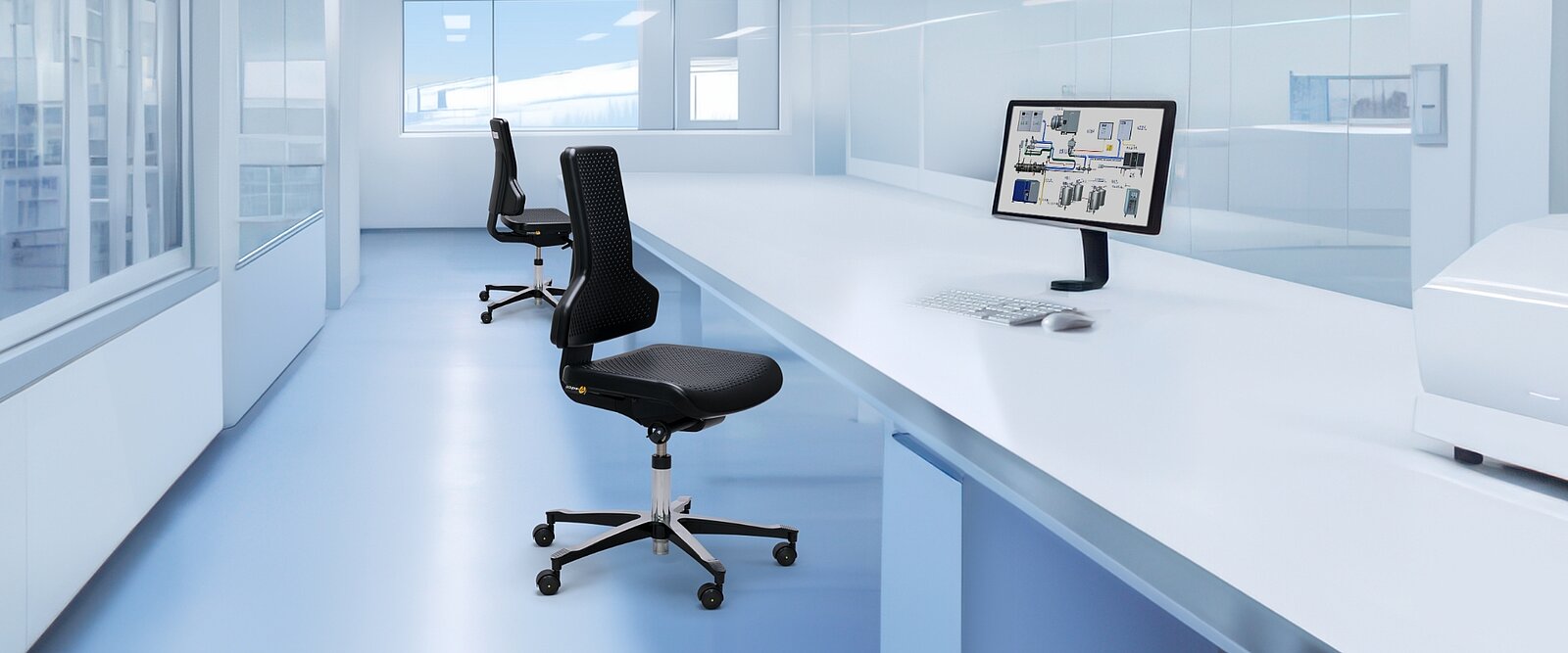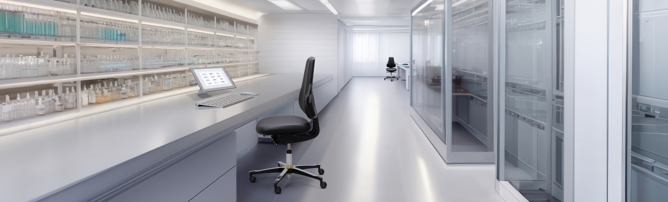 Reinheid en functionaliteit. De inrichting van cleanrooms vraagt om de grootste zorgvuldigheid. De emissie van zelfs de kleinste deeltjes moet extreem laag zijn en daarnaast moet het meubilair garanderen dat elektrostatische lading wordt afgeleid. Gladde oppervlakken, gesealde bekleding, afgedekte mechanieken en geleidende materialen: de modellen die wij voor de cleanroom hebben ontwikkeld voldoen met gemak aan al deze eisen.