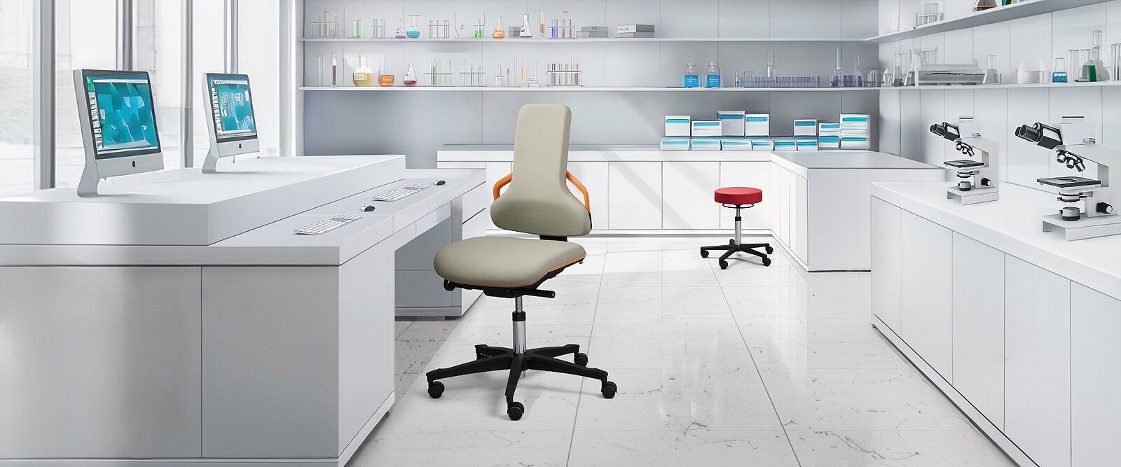 Perfectie tot in details. Wie nauwkeurig en geconcentreerd in een laboratorium moet werken, moet ontspannen zitten. Als iemand in een microscoop kijkt om bijvoorbeeld onderzoeksresultaten vast te leggen, moet de laboratoriumstoel een juiste ergonomische houding mogelijk maken en zich met intelligente technologie aan de desbetreffende zithouding aanpassen.